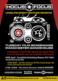 Over the past few months Finders Keepers Records and Manchester’s Dancehouse Theatre have been experimenting with a number of alternative cinema events in their Mancunian hometown attempting to open inquisitive and creative minds to a new world of lost cinema and film music which has seldom, if ever at all, made it to UK theatres in the past. Combining niche genres such as werewolf Hells Angels vs. satanic Aussie biker cults or Czech witchcraft for kids, Finders Keepers has gathered modest audiences in an attempt to bring something unique to fans of alternative cinema while providing a wider perspective to the previously unreleased soundtrack albums we have spent almost a decade remastering and releasing for the loyal global fan base that keeps our cogs turning in these times of uncertain prospects for the independent music, film and art industries. For those who have chose to join us to watch films, listen to our DJs soundtrack collections and drink beer thus far we are very grateful and happy that there is still a community of hopeless cultural escapologists who thirst for unknown pleasures expands beyond the comfort zones of pre-packaged pop and spoon-fed Hollywood designer drivel. The outsiders, the unknowns, the unpolished and the over politicised. Banned, canned and critically slammed. The lost films that make up the Hocus Focus monthly schedule in many cases have simply had nowhere else to go in the last 40 years and the selection at our latest and probably greatest installment will be no exemption. You’re certainly not going to see these films anywhere else anytime soon.